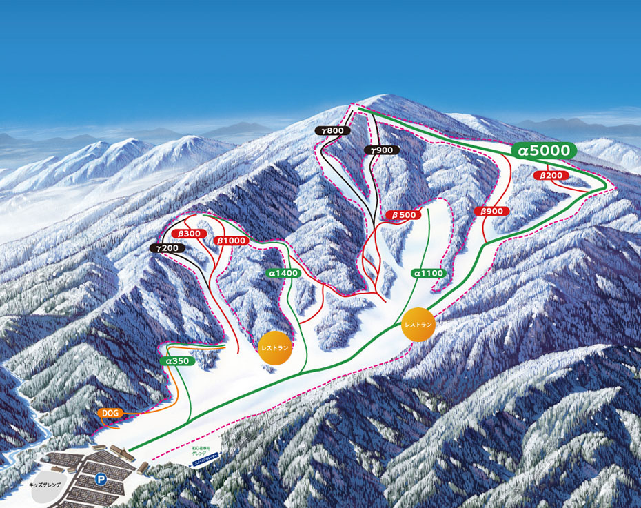 Trail distance 5,000m Peak incline 15 degrees Average slope 8 degrees It is the longest(5000m)&varied trail of Western Japan, attract users of everyone from beginners to experts, Six of the snow features are dotted along on the α 5000 trail is also one of the interesting parts.